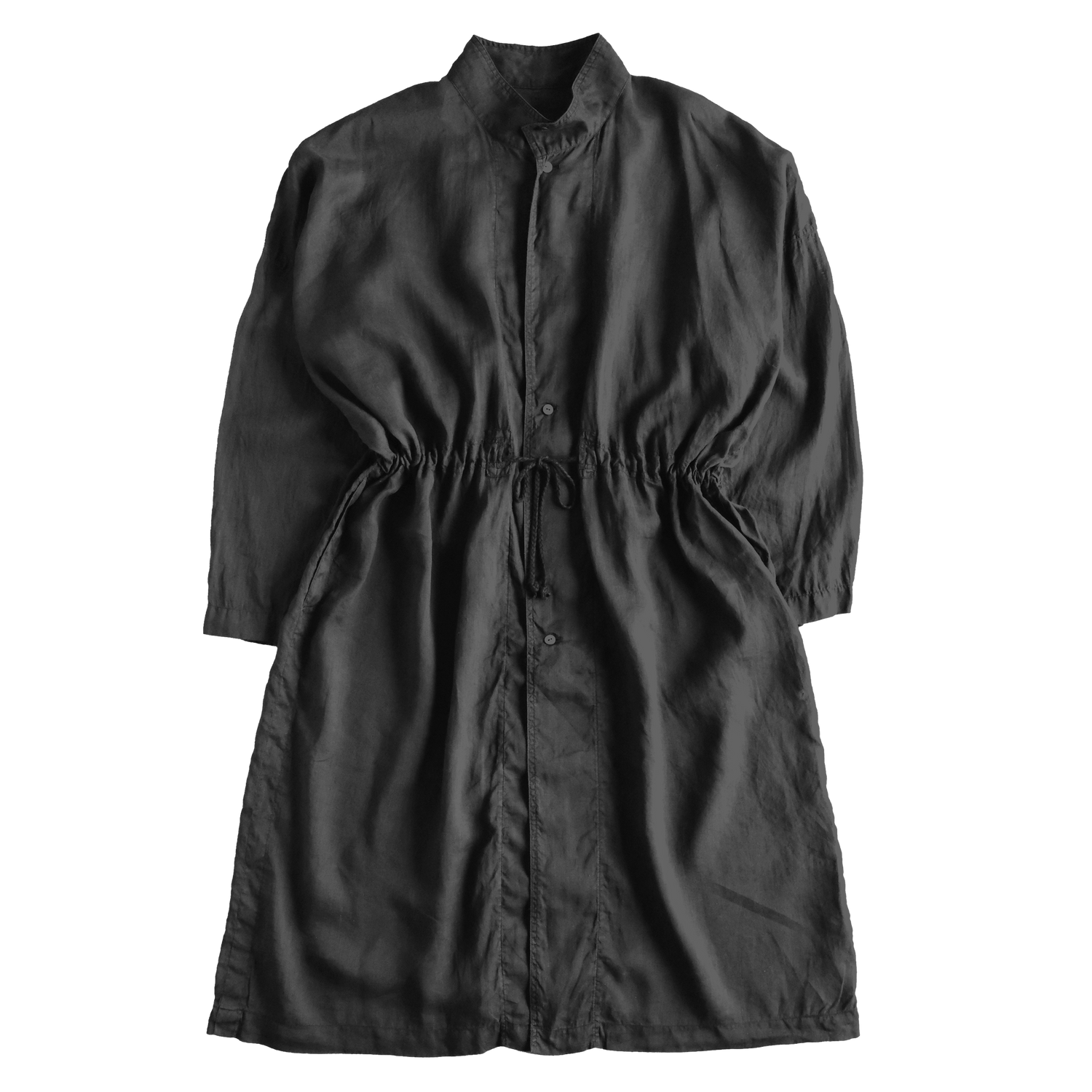 This is a long coat with a stand collar and a generous fit._ The high collar and longer length are designed to shield against strong sunlight from spring to summer and into autumn, and to handle the temperature differences between morning and evening._ Its extremely thin and lightweight design ensures minimal strain even during prolonged wear._ A drawstring cord at the waist allows for adjustment of fit and silhouette._ Side slits provide access to inner pockets on pants or jackets worn underneath.