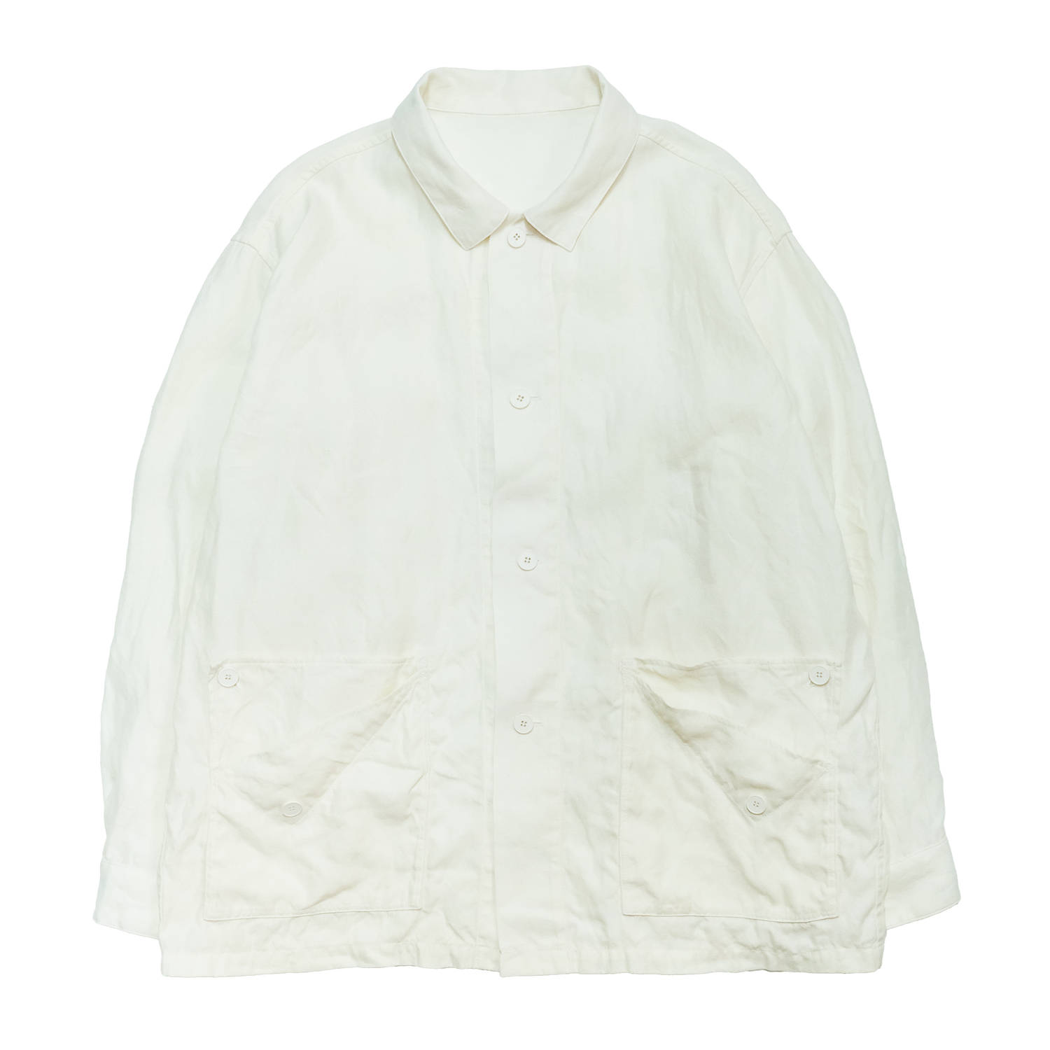 This jacket features a double-layered pocket design inspired by the way paper folds._ The corners can be folded back to function as flaps._ The silhouette is generously proportioned in the body and sleeves, allowing for good ventilation._ Combined with the inherent lightness of the fabric, it's comfortable to wear from spring to autumn._ The buttons are made from compressed cotton and are dyed along with the fabric during the garment dyeing process.