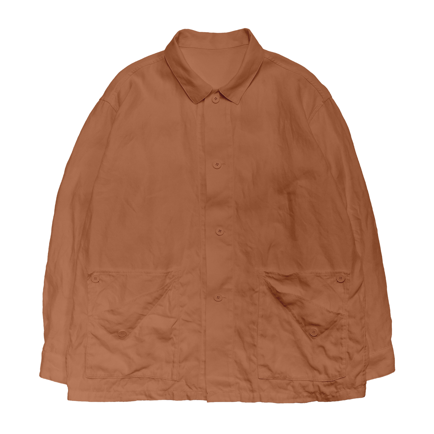 This jacket features a double-layered pocket design inspired by the way paper folds._ The corners can be folded back to function as flaps._ The silhouette is generously proportioned in the body and sleeves, allowing for good ventilation._ Combined with the inherent lightness of the fabric, it's comfortable to wear from spring to autumn._ The buttons are made from compressed cotton and are dyed along with the fabric during the garment dyeing process.