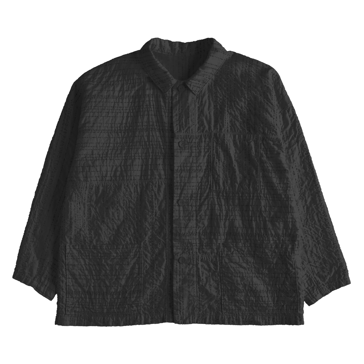 This is a double-layered original fabric with a unique structure._ The warp threads are made of organic cotton, while the weft threads on the surface and reverse are made of ramie and hemp respectively._ Thick silk threads are used to create a sashiko-like pattern through a special bonding process. The surface, where the organic cotton and ramie sheen blend, gives a light and airy impression. The reverse, which touches the skin, offers the cool feel of hemp and the soft touch of cotton._ Sashiko originally comes from Japanese handwork where old pieces of cloth were layered and sewn together for reinforcement and warmth._ This fabric doesn't imitate the irregularity of that handwork with machinery; instead, it utilizes the regular structure inherent in machine weaving to create a unique pattern that evokes a sense of rhythm within order.