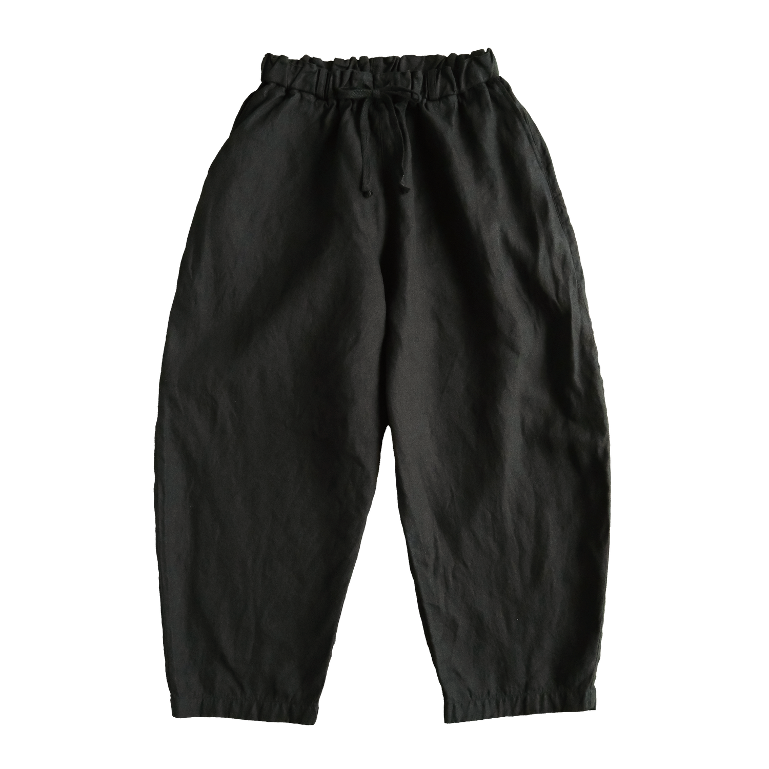 These pants are patterned after Monpe and Tatsuke (traditional Japanese clothing)._ Characterized by a high waist and a sharp taper from the knee to the hem, they offer ample freedom of movement and can be adjusted in silhouette by rolling up the legs._ The waist features elastic and a drawstring, allowing them to be worn without a belt, though belt loops are also included for added support when carrying weight._ The design is simple and understated, prioritizing functionality, and is suitable for a wide range of body types and allows for a choice of preferred fit._ The waist drawstring uses hemp cord.