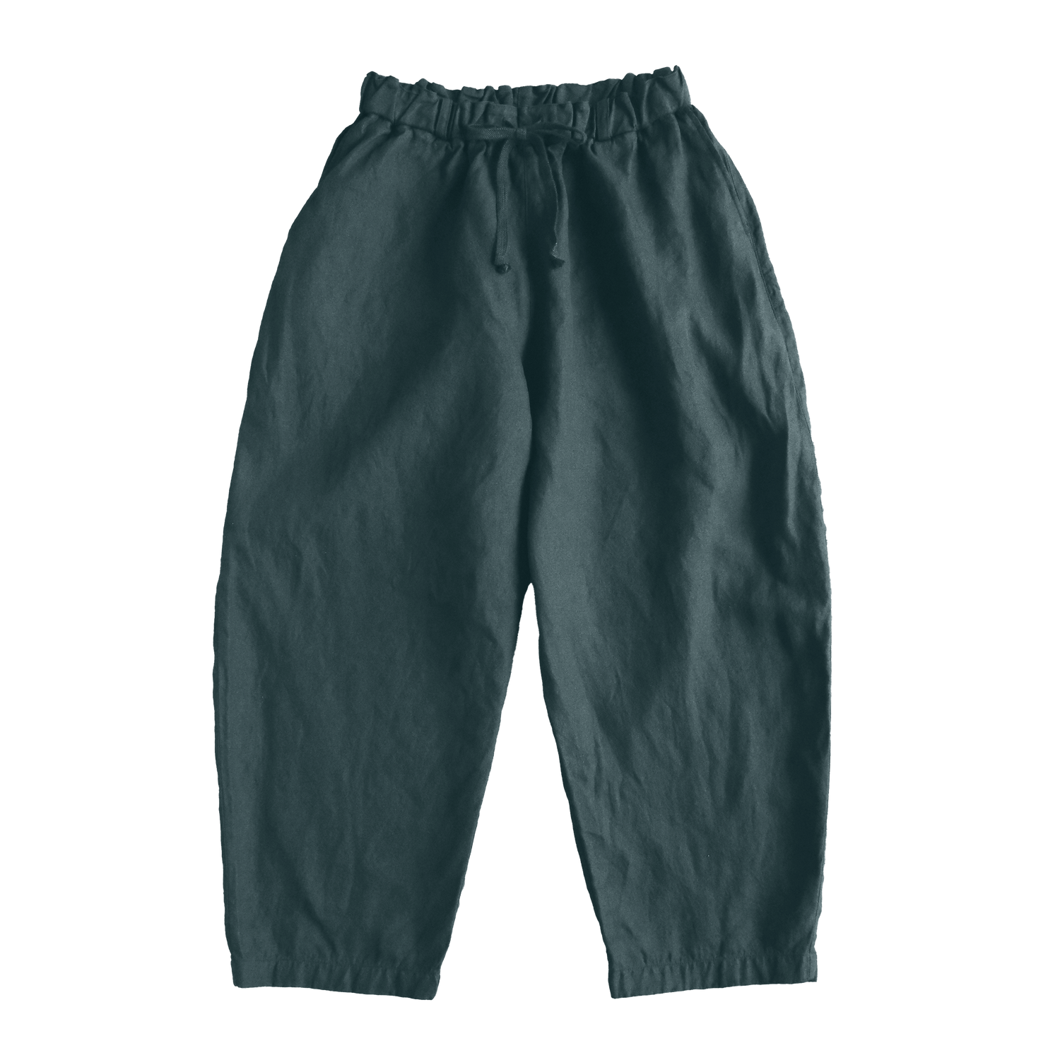 These pants are patterned after Monpe and Tatsuke (traditional Japanese clothing)._ Characterized by a high waist and a sharp taper from the knee to the hem, they offer ample freedom of movement and can be adjusted in silhouette by rolling up the legs._ The waist features elastic and a drawstring, allowing them to be worn without a belt, though belt loops are also included for added support when carrying weight._ The design is simple and understated, prioritizing functionality, and is suitable for a wide range of body types and allows for a choice of preferred fit._ The waist drawstring uses hemp cord.