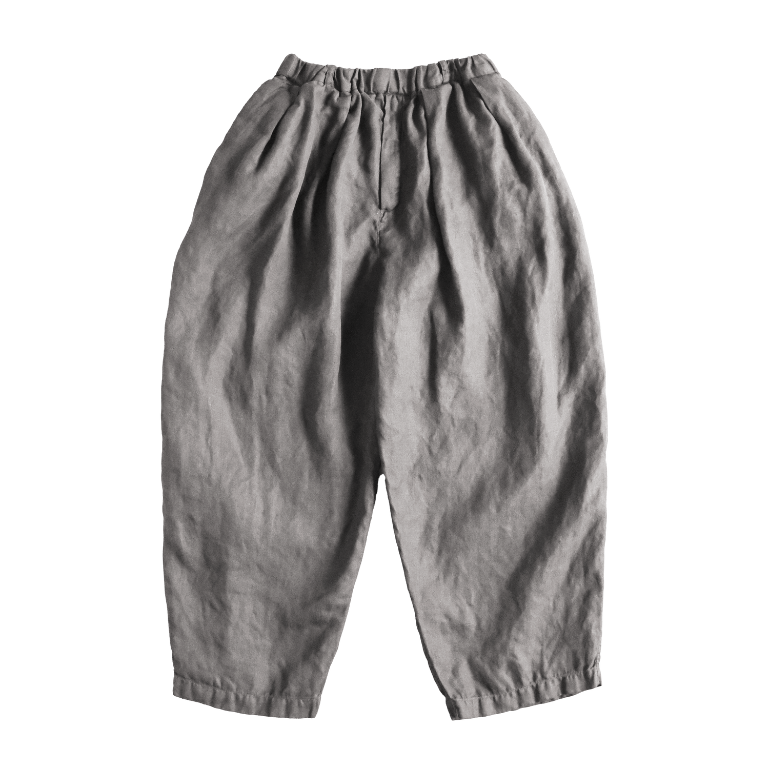 These wide-leg pants feature two large front tucks to create volume._ They are designed to flatter the body, offering a relaxed fit that doesn't cling._ The relatively short length makes them surprisingly easy to style and suitable for a variety of looks._ The back pockets are a unique design using a contrasting fabric._ The waist can be adjusted with the hemp drawstring on the inside of the belt.