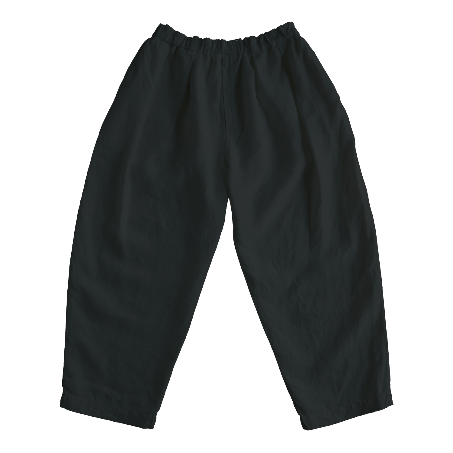 These are wide-leg pants that gently taper towards the hem._ Two large front tucks add volume._ They are not clingy and maintain a comfortable distance from the body, suitable for various body types._ The relatively short length makes them surprisingly easy to style and incorporate into a variety of looks, despite their volume._ The waist can also be adjusted with the hemp cord binding on the inside of the belt.