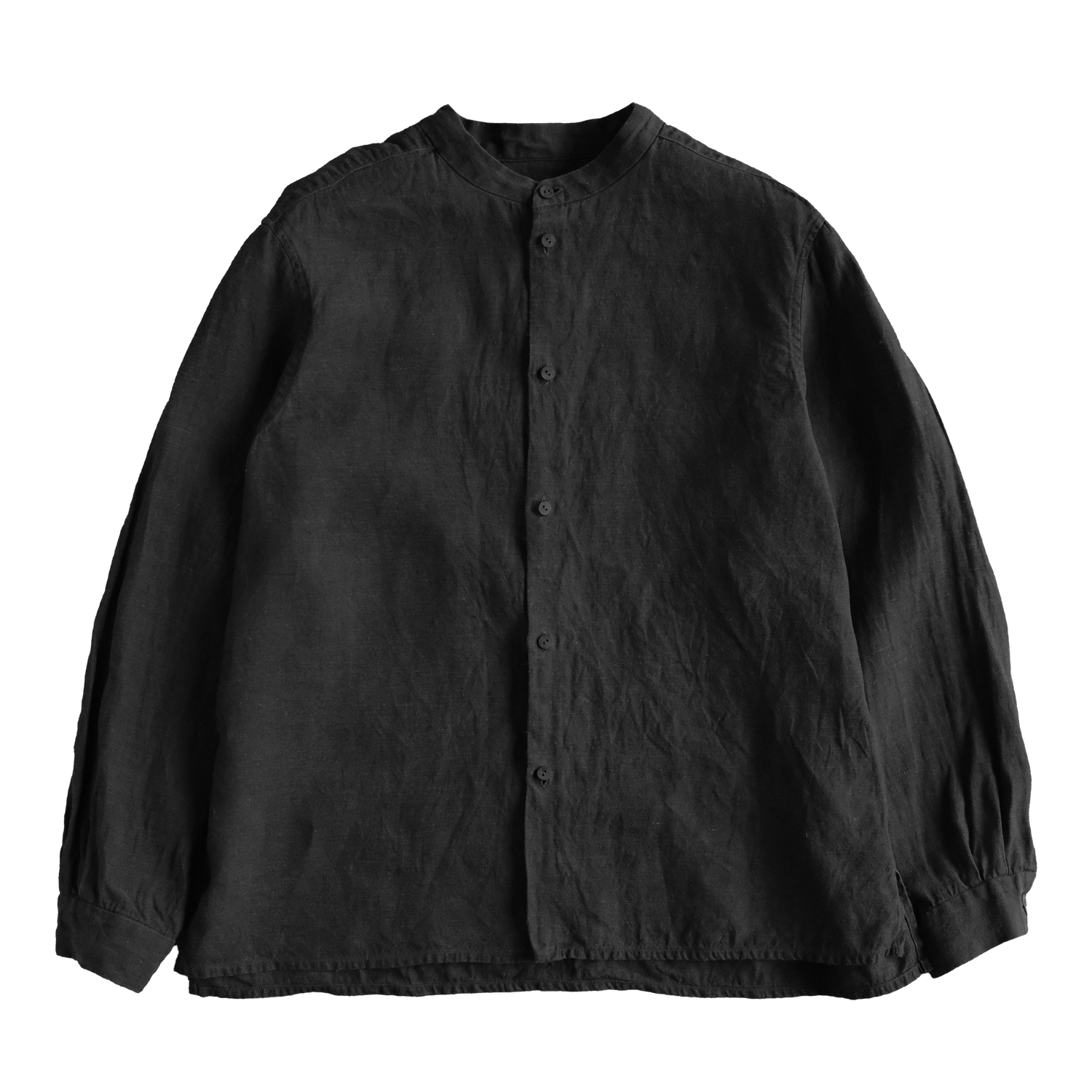 This shirt features a slightly oversized silhouette with a comfortable fit and a shorter length. To highlight the natural wrinkles and texture of the fabric, the visible stitching is kept to a minimum, except where strength is required. The cuffs are folded and sewn, inspired by the way paper is folded, making it easy to find the correct position for fastening the buttons on the cuffs without looking. The buttons are made of compressed cotton material and are dyed along with the fabric during the garment dyeing process.