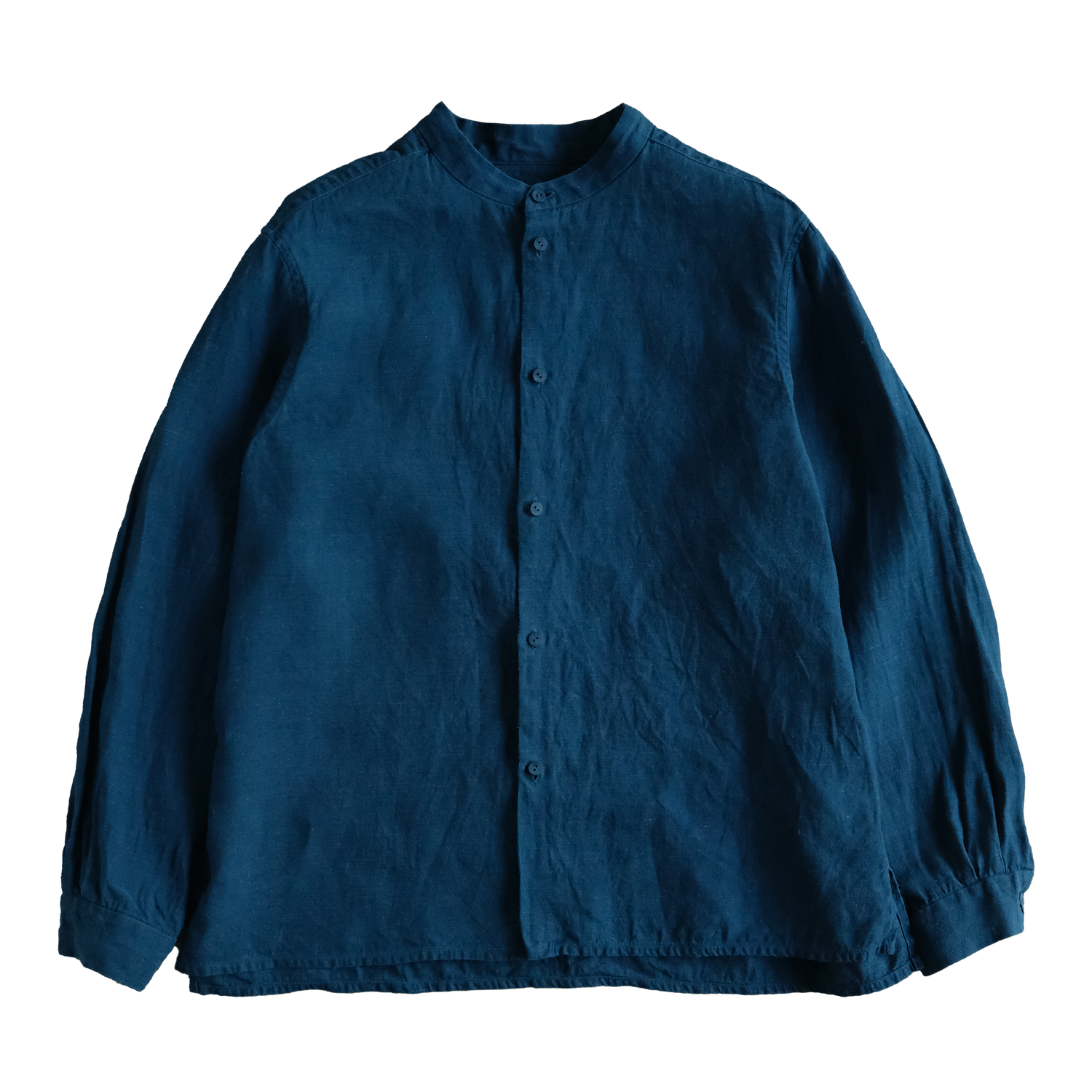 This shirt features a slightly oversized silhouette with a comfortable fit and a shorter length. To highlight the natural wrinkles and texture of the fabric, the visible stitching is kept to a minimum, except where strength is required. The cuffs are folded and sewn, inspired by the way paper is folded, making it easy to find the correct position for fastening the buttons on the cuffs without looking. The buttons are made of compressed cotton material and are dyed along with the fabric during the garment dyeing process.