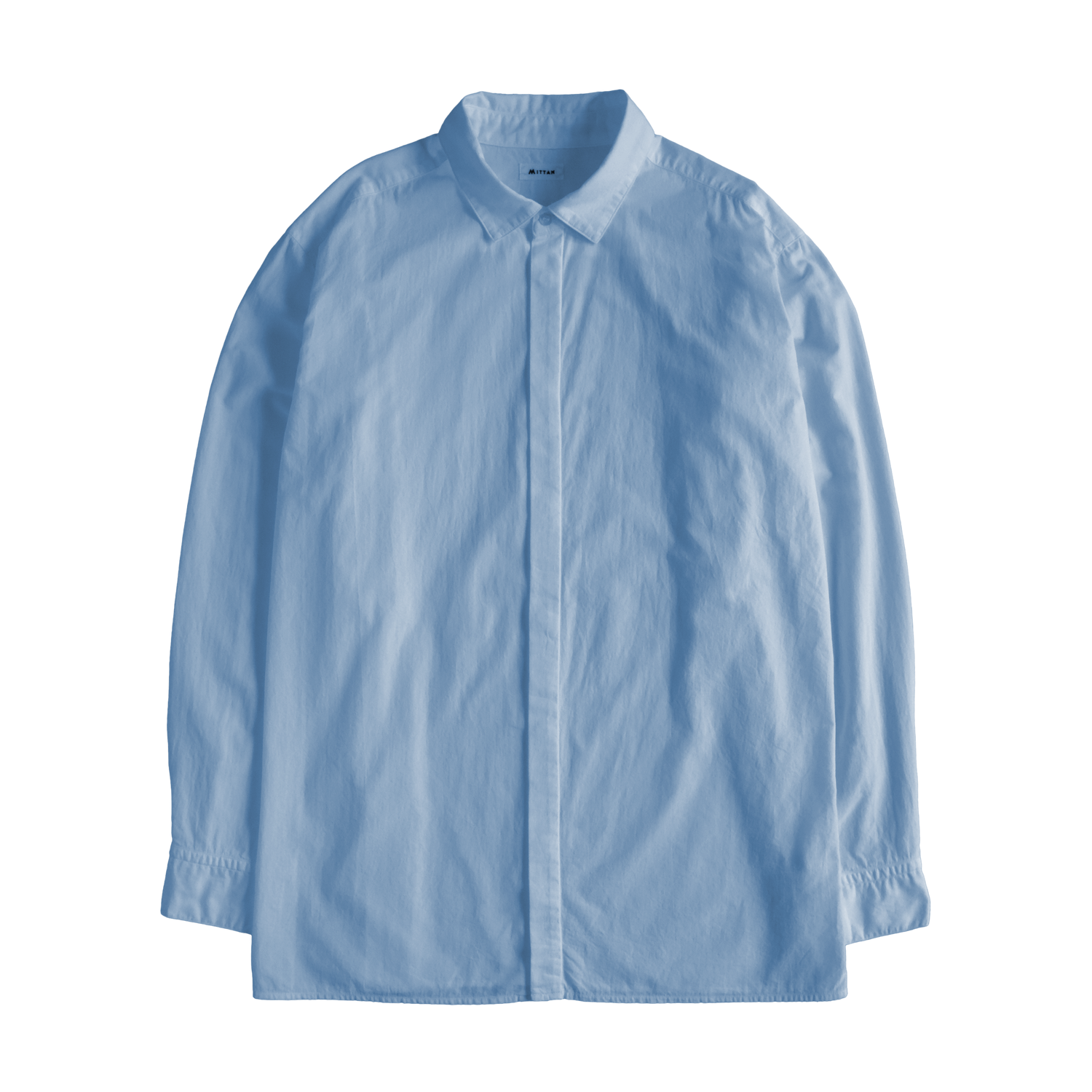 This shirt represents a new take on the orthodox design within the MITTAN collection._ Its moderately relaxed silhouette, combined with the stretch of the tightly-spun fabric, ensures comfortable wear._ With a focus on eliminating unnecessary details, it features a simple design with a concealed placket and simple cuff openings._ The visible stitching is minimized, allowing the expressive nature of the garment dyeing to stand out._ The pattern is based on functionality, making it versatile enough for casual or dressy occasions._ Shell buttons are used.