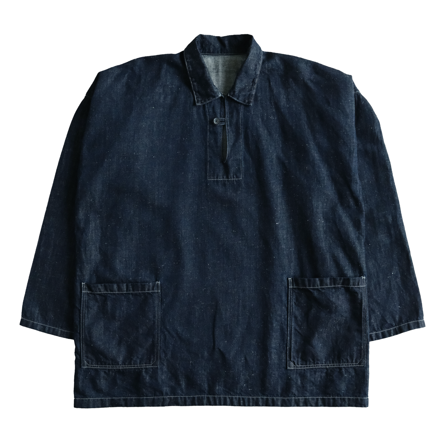 This is a pullover shirt with a wide body and a substantial, voluminous feel._ Almost all parts are constructed with a straight-line pattern, and the planar shape naturally adapts to a variety of body types, much like a kimono._ Pockets are included for convenience as a practical everyday garment._ The pocket stitching is designed to prevent dust and lint from accumulating inside by rounding the corners._ The buttons are made of water buffalo horn.