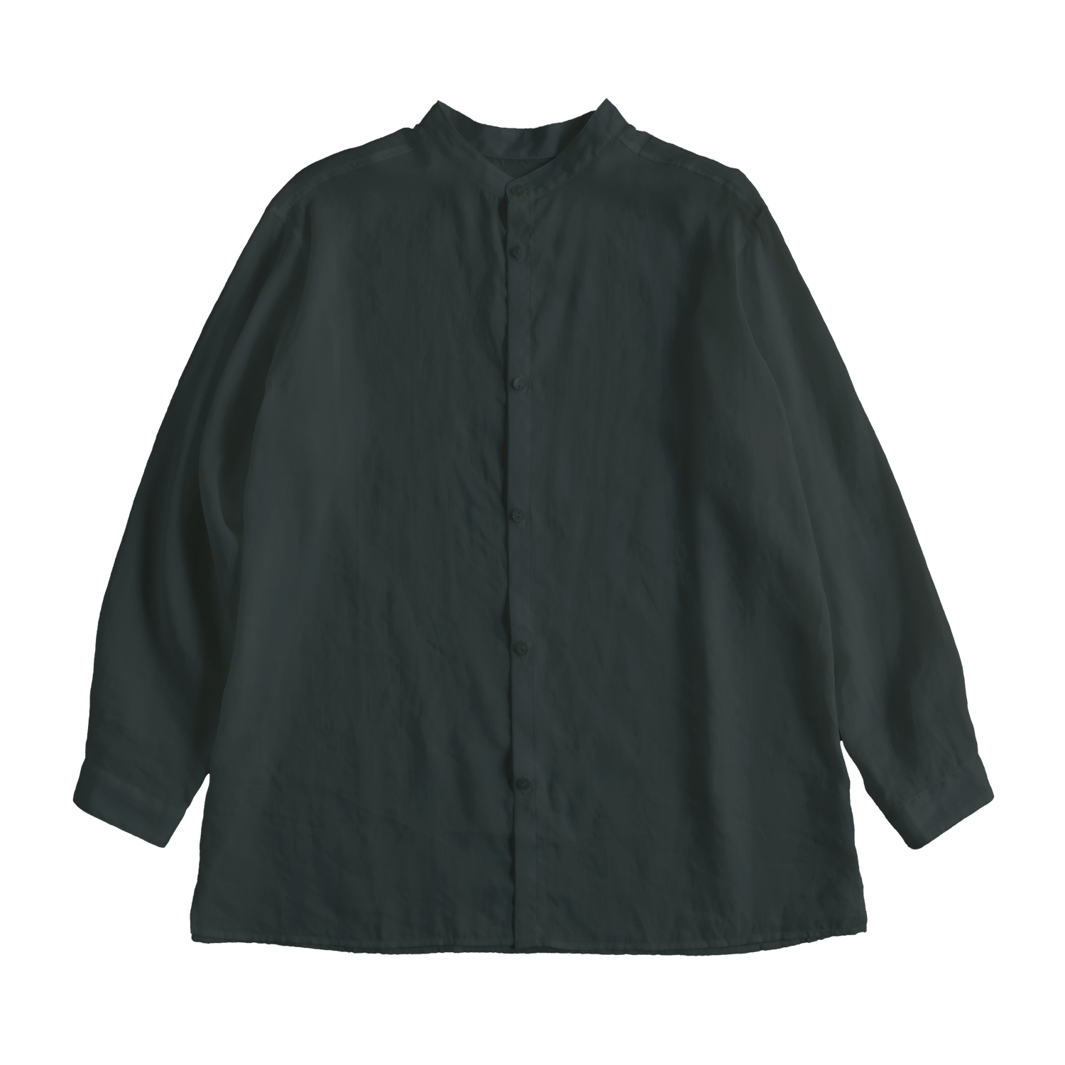 This shirt features a silhouette with a comfortable, relaxed fit, perfect for everyday wear, while still taking advantage of the fabric's sheer quality._ It incorporates functional details such as gathers in the sleeve cap for ease of movement and slits in the sides, all while maintaining a simple design._ The lack of cut-in cuffs and the use of a folded and stitched shoulder seam (without a yoke) minimizes stress on the delicate fabric._ Shell buttons are used.