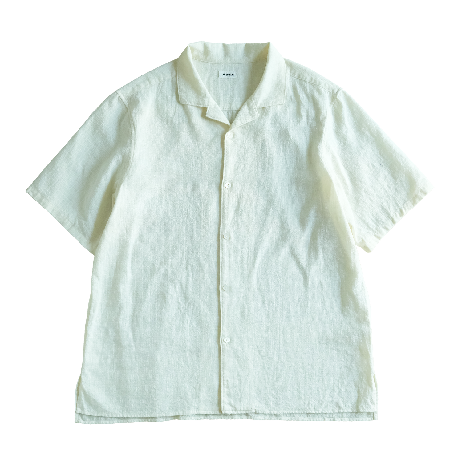 This is a short-sleeved shirt with a moderately loose fit and a functional, minimalist design. The open collar is designed to be small, and the armhole is set high by incorporating gathers into the sleeve head, ensuring ample movement around the arms. The back has no yoke, and instead of tucks or gathers, gathers are used to naturally accommodate the movement of the back. The fabric, a wool and linen check that has been a staple in the past, has been incorporated into a new basic silhouette. Shell buttons are used for the buttons.