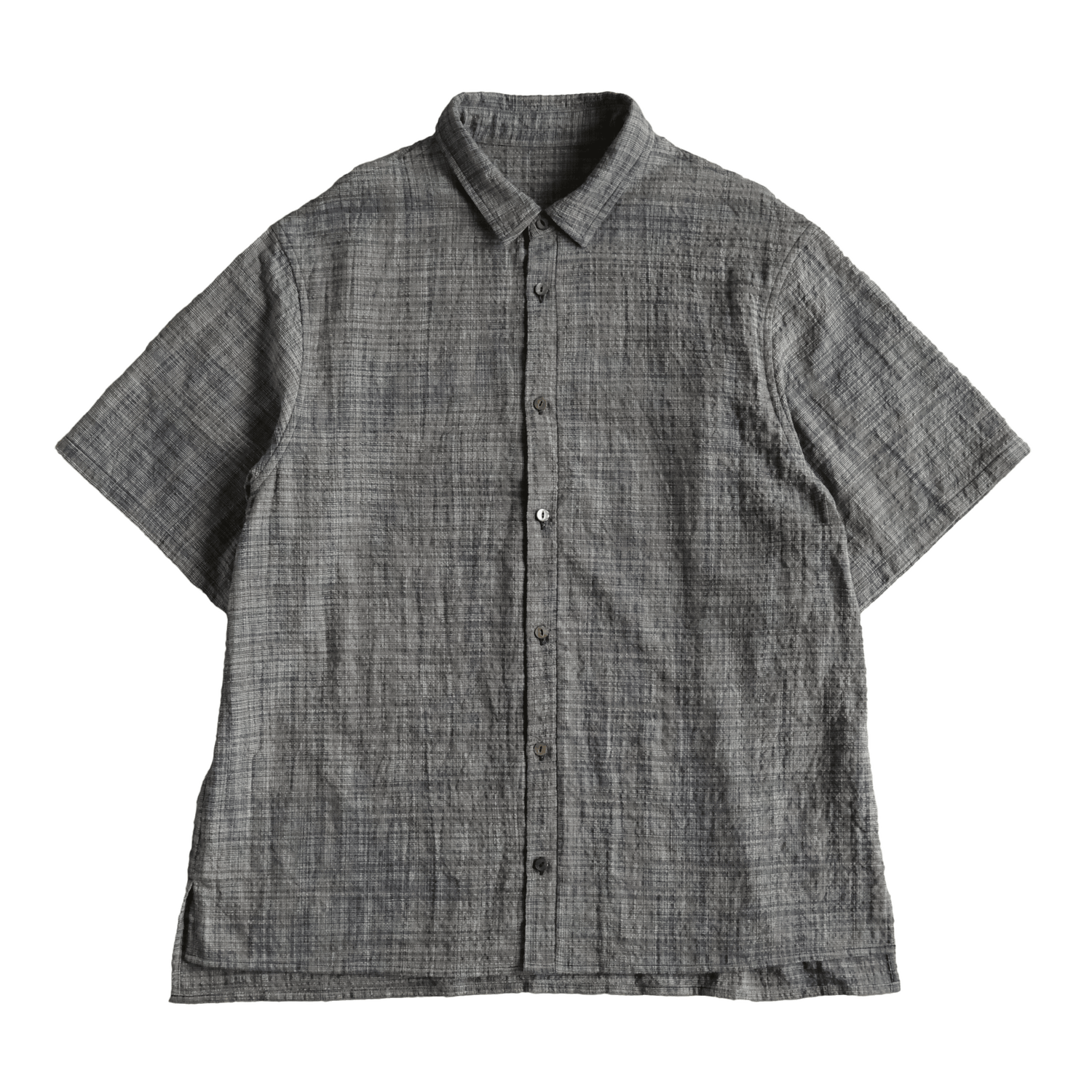 This shirt is designed with a functional pattern that follows the structure of Western clothing while minimizing embellishments._ The inclusion of shoulder gathers ensures freedom of movement around the shoulders, and slits in the sides increase the range of motion._ The fabric itself is stretchy, conforming to movement and reducing strain on the body._ Cat-eye shell buttons are used, and their concave shape in the center minimizes thread wear, ensuring durability.