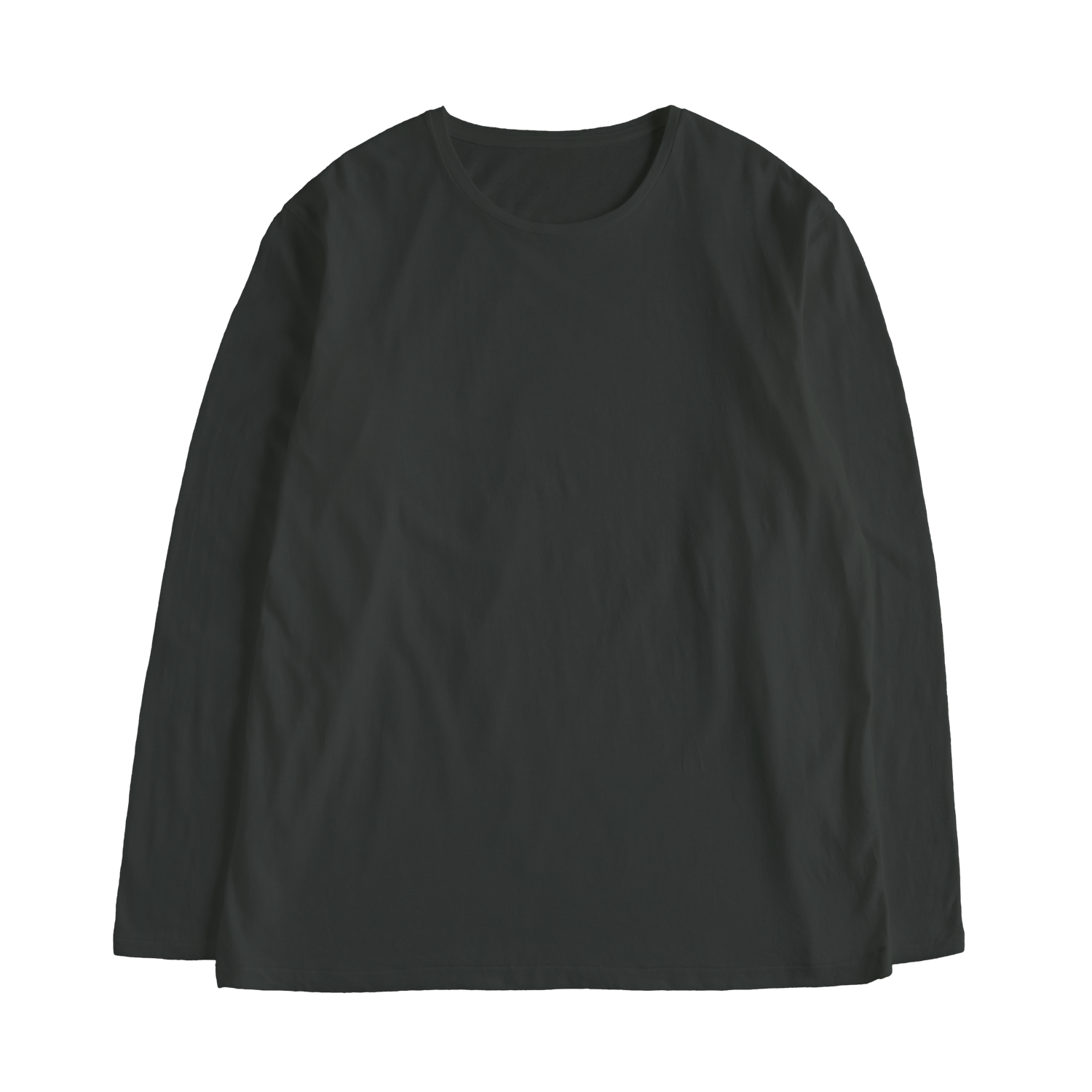 This is a long-sleeved T-shirt with a vertical silhouette that is designed with fit and functionality in mind, making it suitable for wearing alone or as an inner layer. The slightly longer length makes it easy to tuck in. The hem and cuffs feature a traditional "Tengibiki" stitch, which keeps the stitching lines from showing on the surface and maintains high strength, but requires a high level of craftsmanship. This design gives the overall garment a minimalist look and makes the color of the garment dyeing stand out even more. The neckline uses the same fabric with a different weave to prevent stretching even with age. The shoulder and neckline are reinforced with a "Takobinder" stitch, giving the T-shirt sufficient strength.