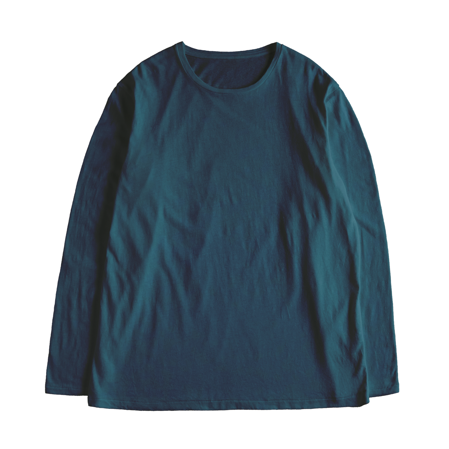 This is a long-sleeved T-shirt with a vertical silhouette that is designed with fit and functionality in mind, making it suitable for wearing alone or as an inner layer. The slightly longer length makes it easy to tuck in. The hem and cuffs feature a traditional "Tengibiki" stitch, which keeps the stitching lines from showing on the surface and maintains high strength, but requires a high level of craftsmanship. This design gives the overall garment a minimalist look and makes the color of the garment dyeing stand out even more. The neckline uses the same fabric with a different weave to prevent stretching even with age. The shoulder and neckline are reinforced with a "Takobinder" stitch, giving the T-shirt sufficient strength.
