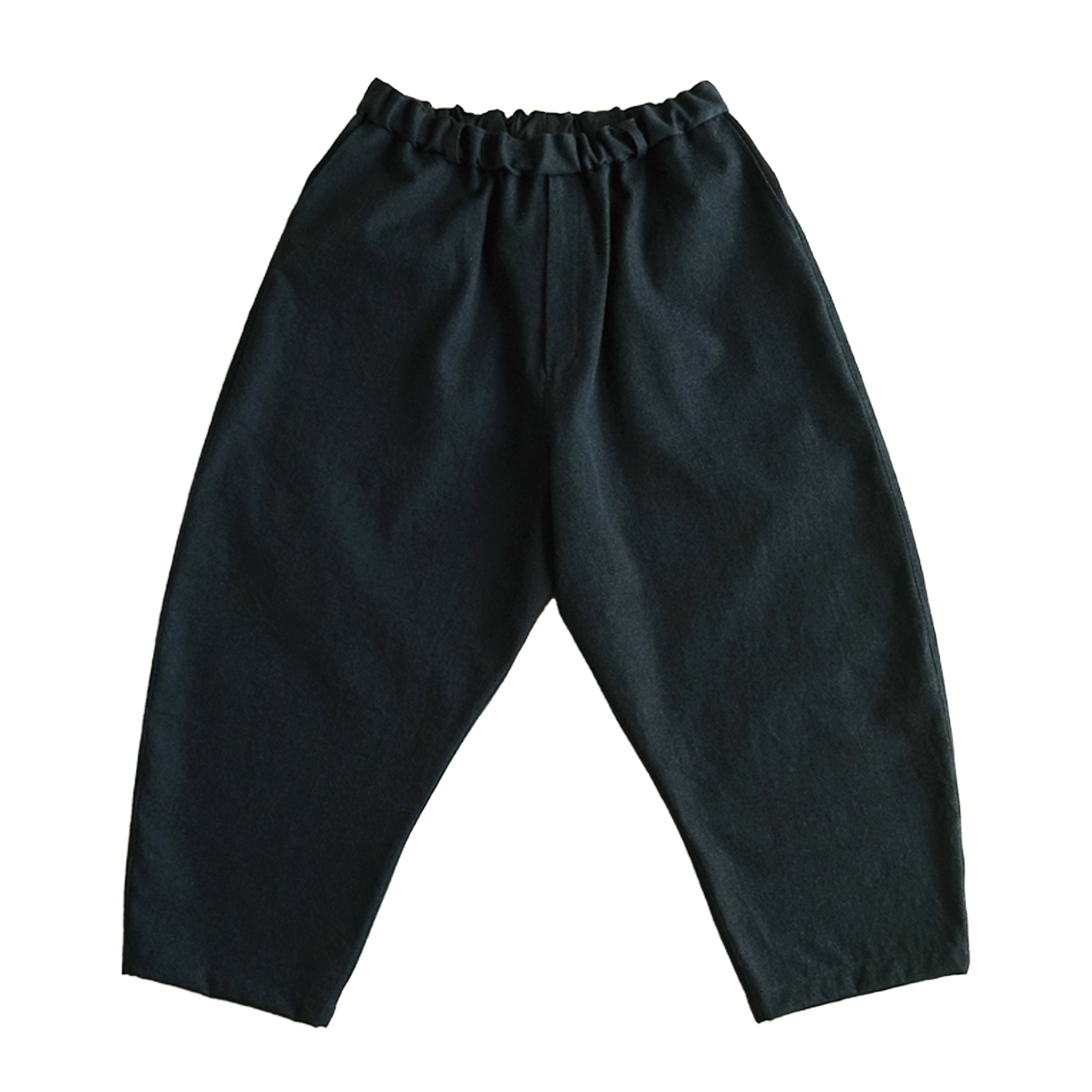 パターンはもんぺやたっつけを参考にしたMITTANの定番的なシルエットのパンツです。股上は深いものの、運動量を確保しているので動きやすいのが特徴で、膝から裾にかけて入っている急なテーパードは、ロールアップによって調整が可能です。機能性を備えながらもシンプルなデザインの為、体型を問わず好みのサイズ感を選んでいただけます。後ろポケットは、切り替えを利用した仕様になっています。